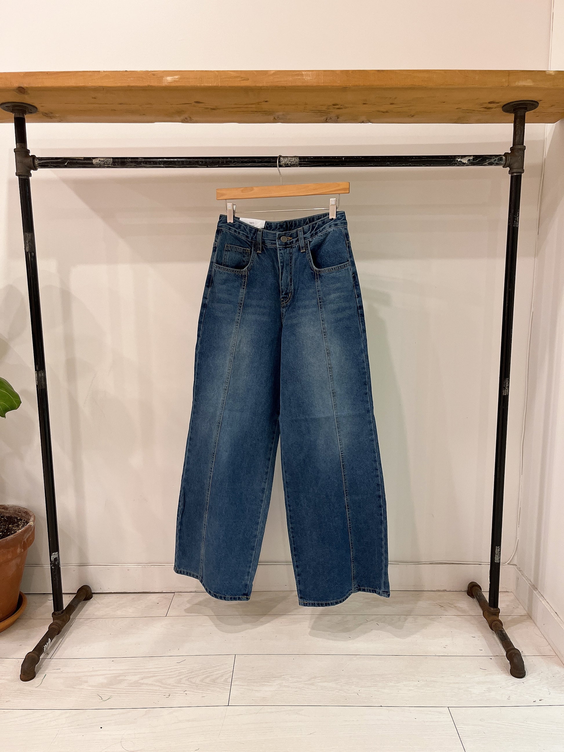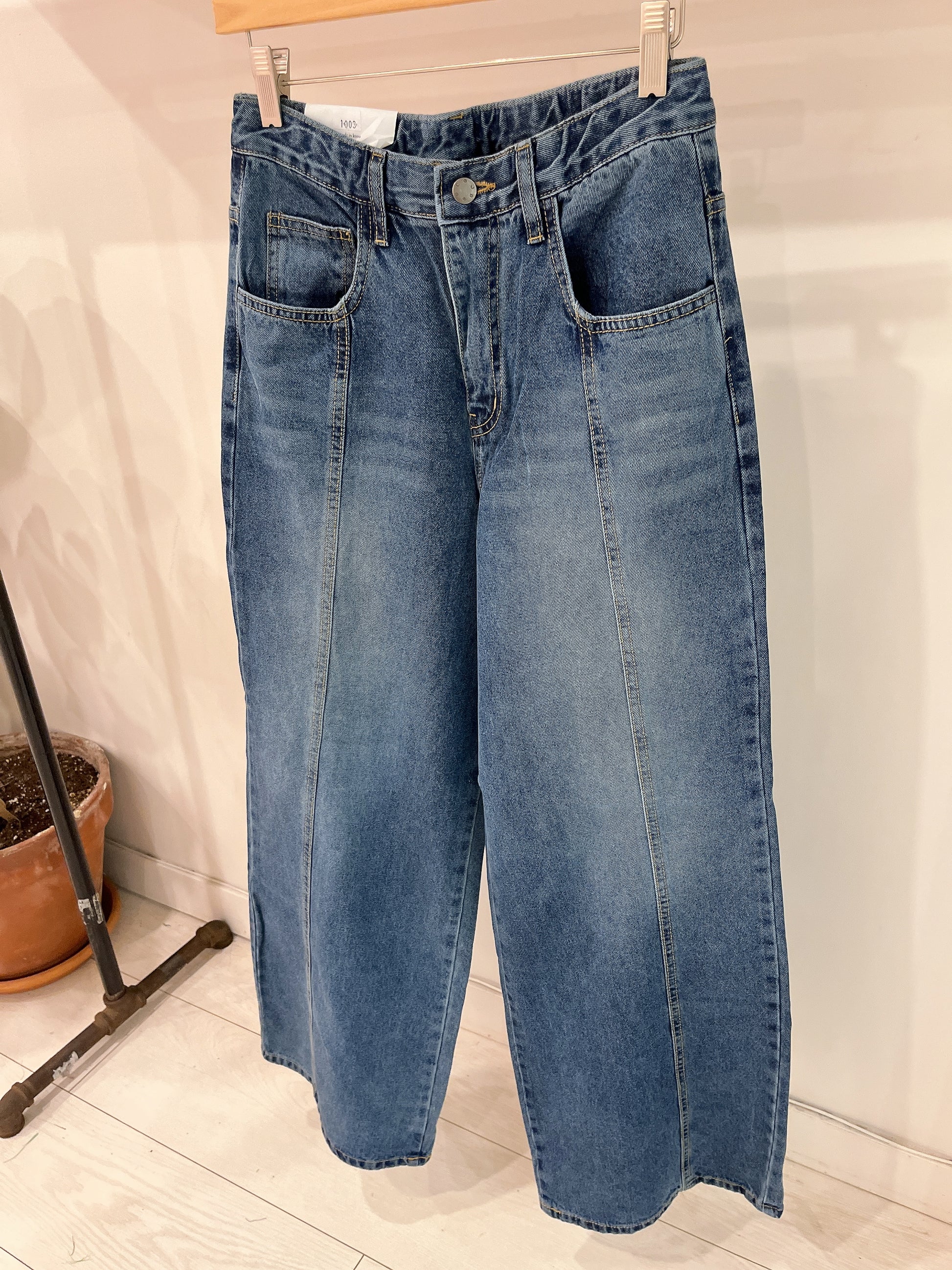 Super chic and comfy, our wide-legged jeans with a centre seam are perfectly mid-rise with an ankle-length, baggy fit. They feature a dark wash, front zipper and button closure, belt loops, and slash side and back pockets!
