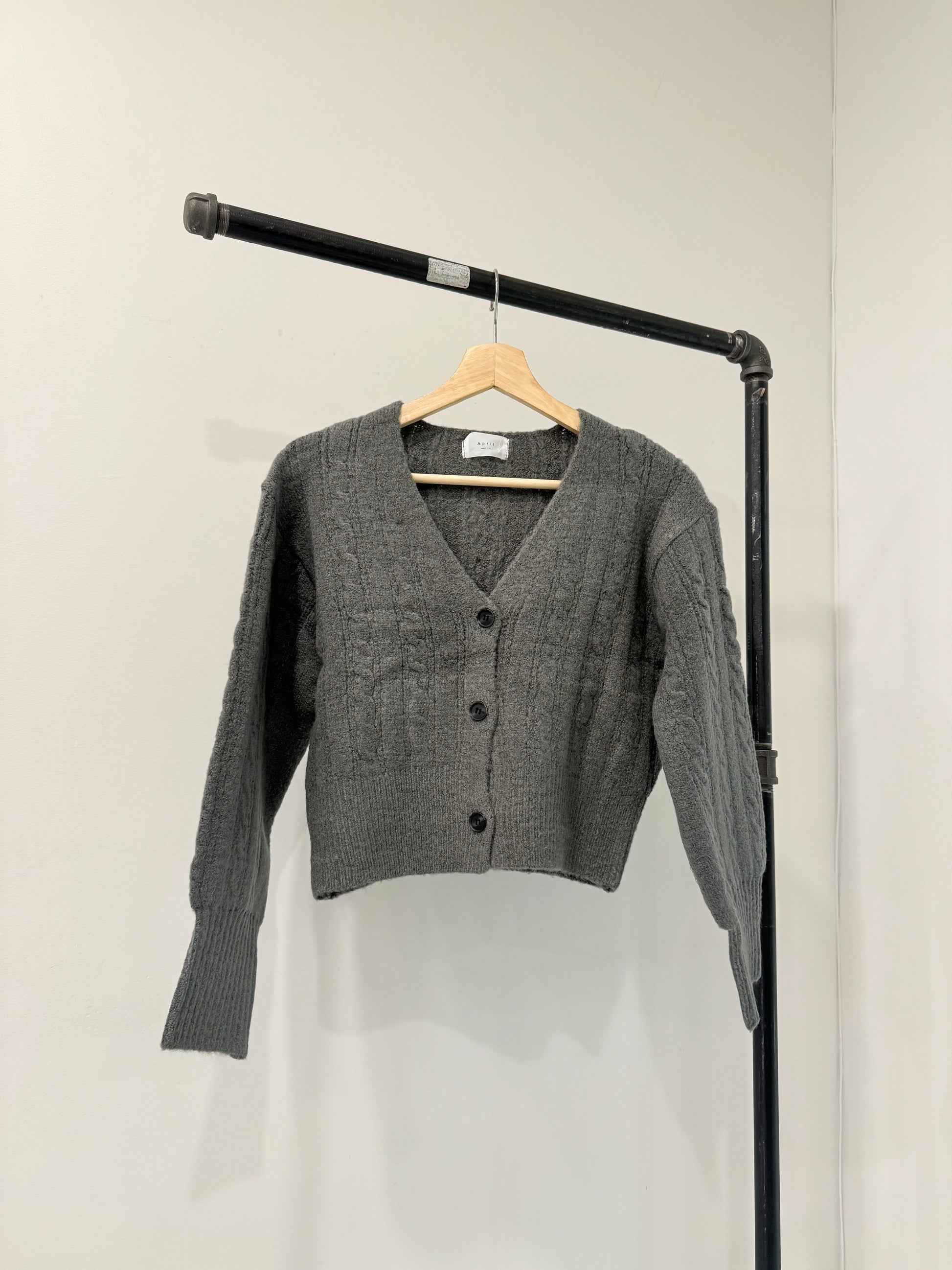A classic cable-knit cardigan with a modern, easy silhouette. Soft, cozy, and lightly cropped, it features a clean V-neckline, relaxed sleeves, and simple button-front detailing that keeps the look timeless. Perfect for layering over tees, turtlenecks, or dresses, it adds warmth without the bulk and pairs effortlessly with any fall or winter outfit.