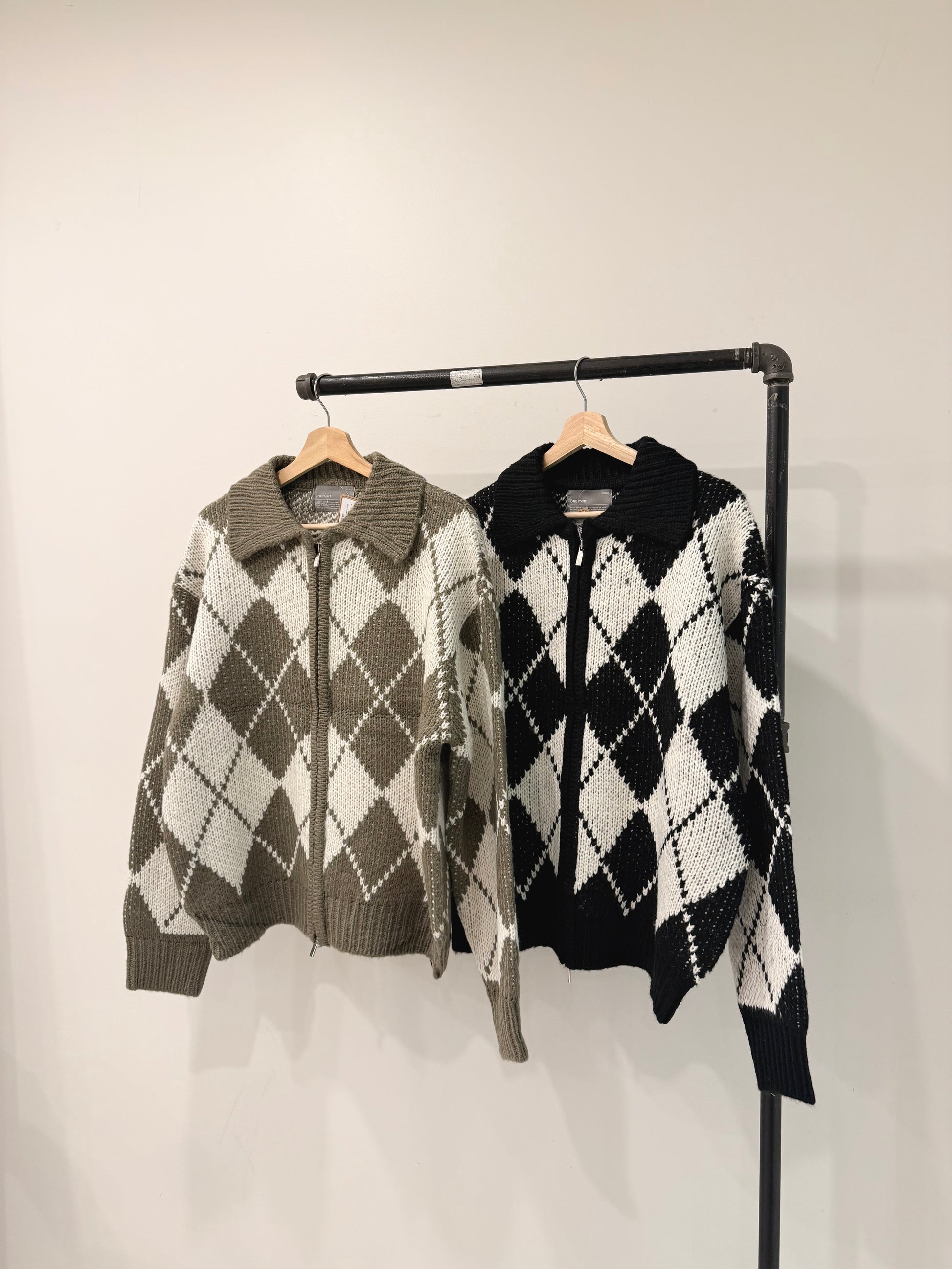 Cozy, boxy silhouettes and timeless prints — a foolproof combo for fall. this zip-up argyle knit sweater features a soft, textured feel with a cozy, boxy silhouette that layers beautifully. Designed with a crew neckline and finished with ribbed detailing along the cuffs, hem, and neckline for that polished touch. The zip-up front adds versatility, letting you wear it open or closed for different looks. Available in two playful color options — khaki and black — for an effortlessly cool fall vibe.