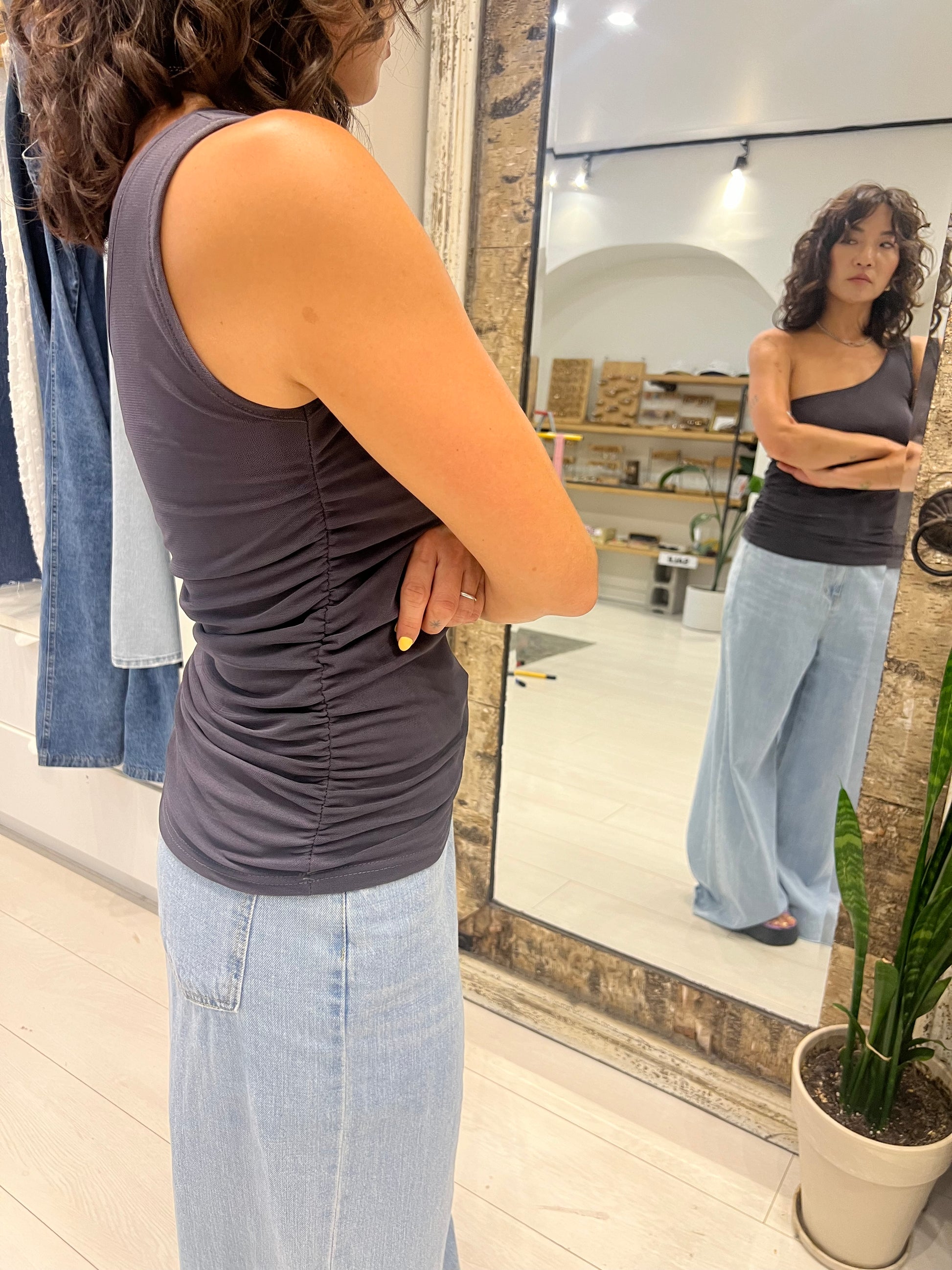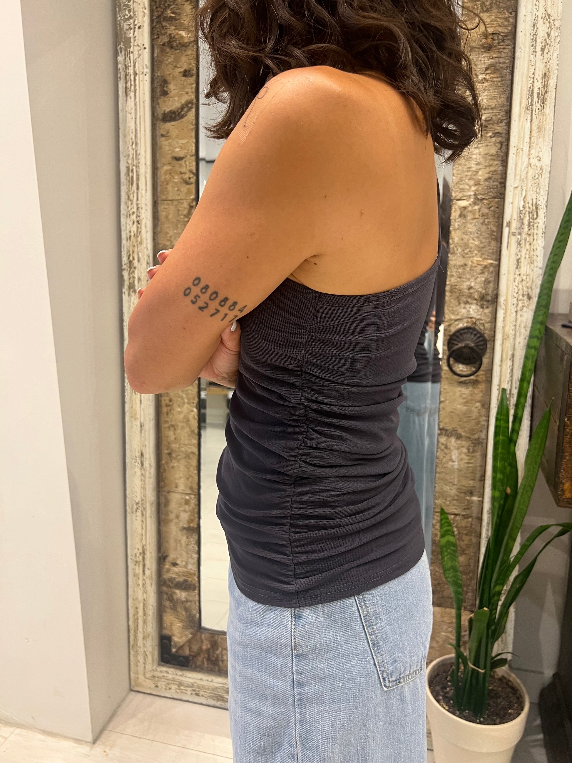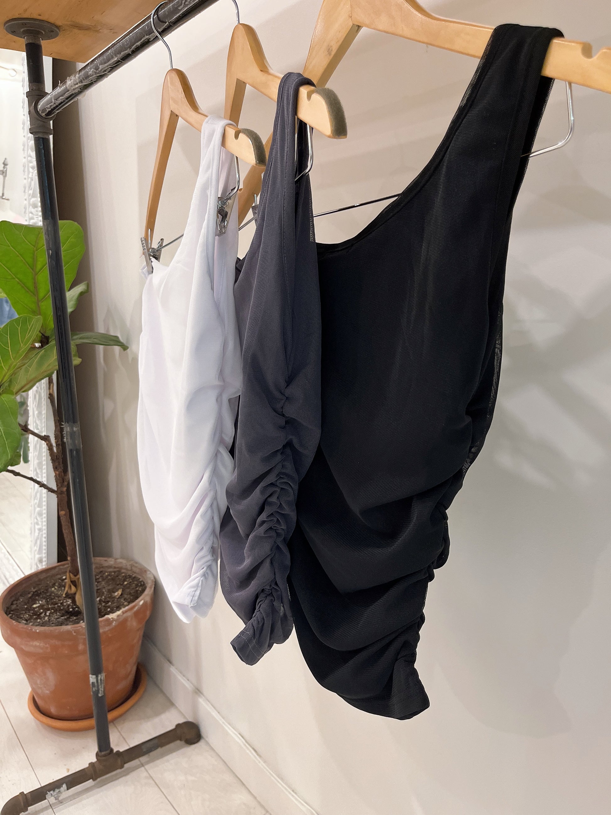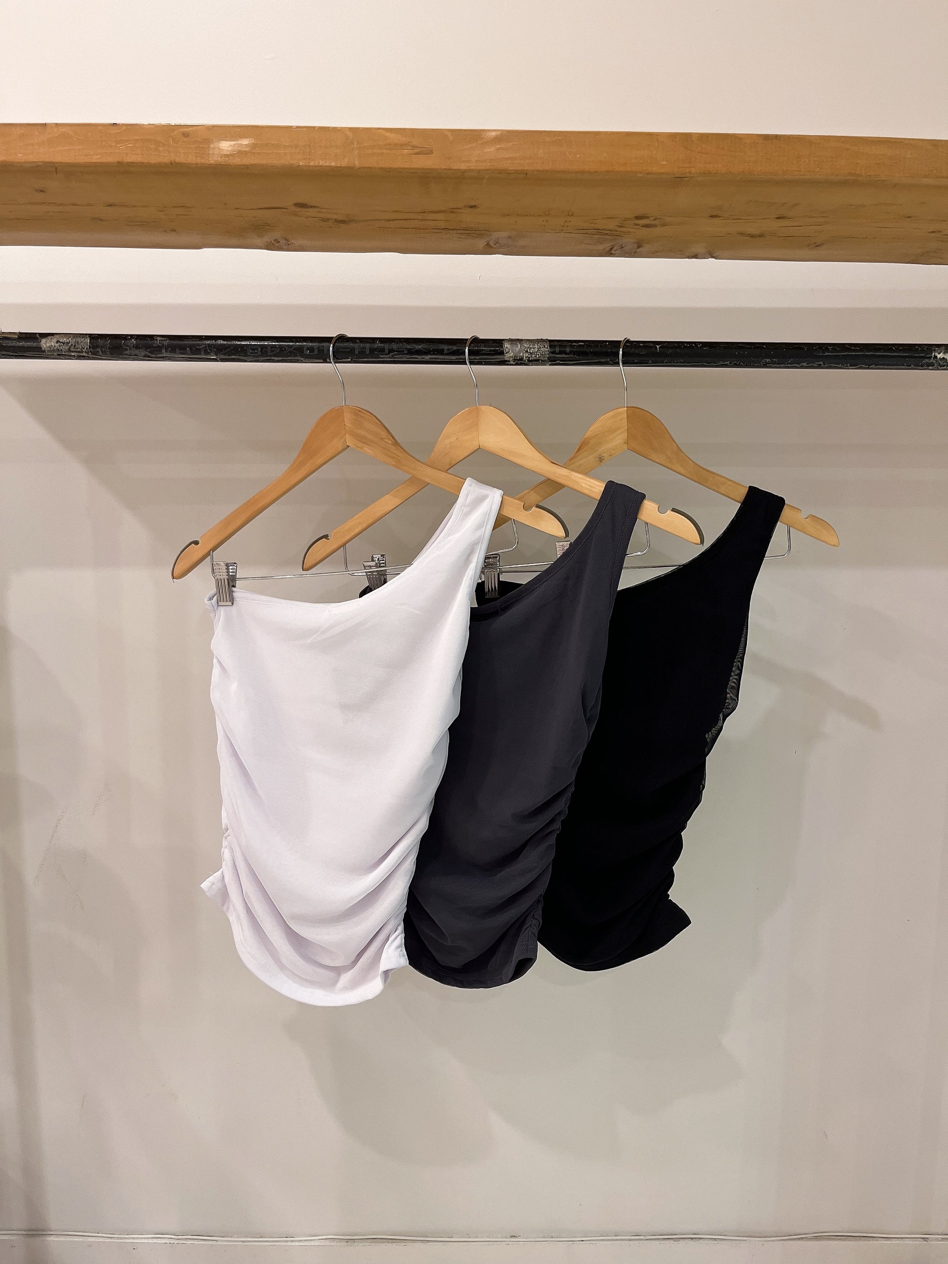 Perfectly fitted, this gorgeous one-shoulder mesh top with ruched sides comes with a multi-purpose matching ribbon for versatile styling options! Grab this going-out number in black, gray or white!