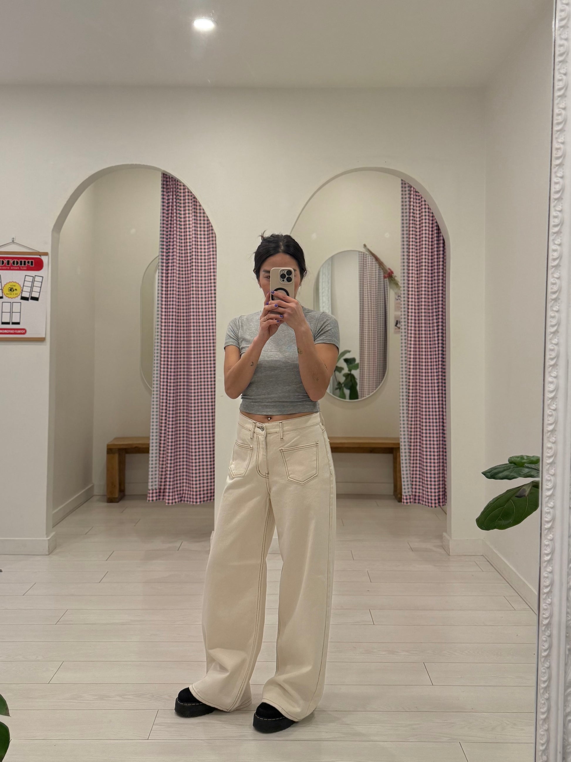 Tailored to perfection and designed for that off-duty chic vibe, our off-white wide-legged stitch pants offer the perfect mid-rise fit. They feature an overall contrast brown stitching detail, front pockets, belted loops, a discreet zipper, and a front button closure—a minimalist piece with versatile styling options.