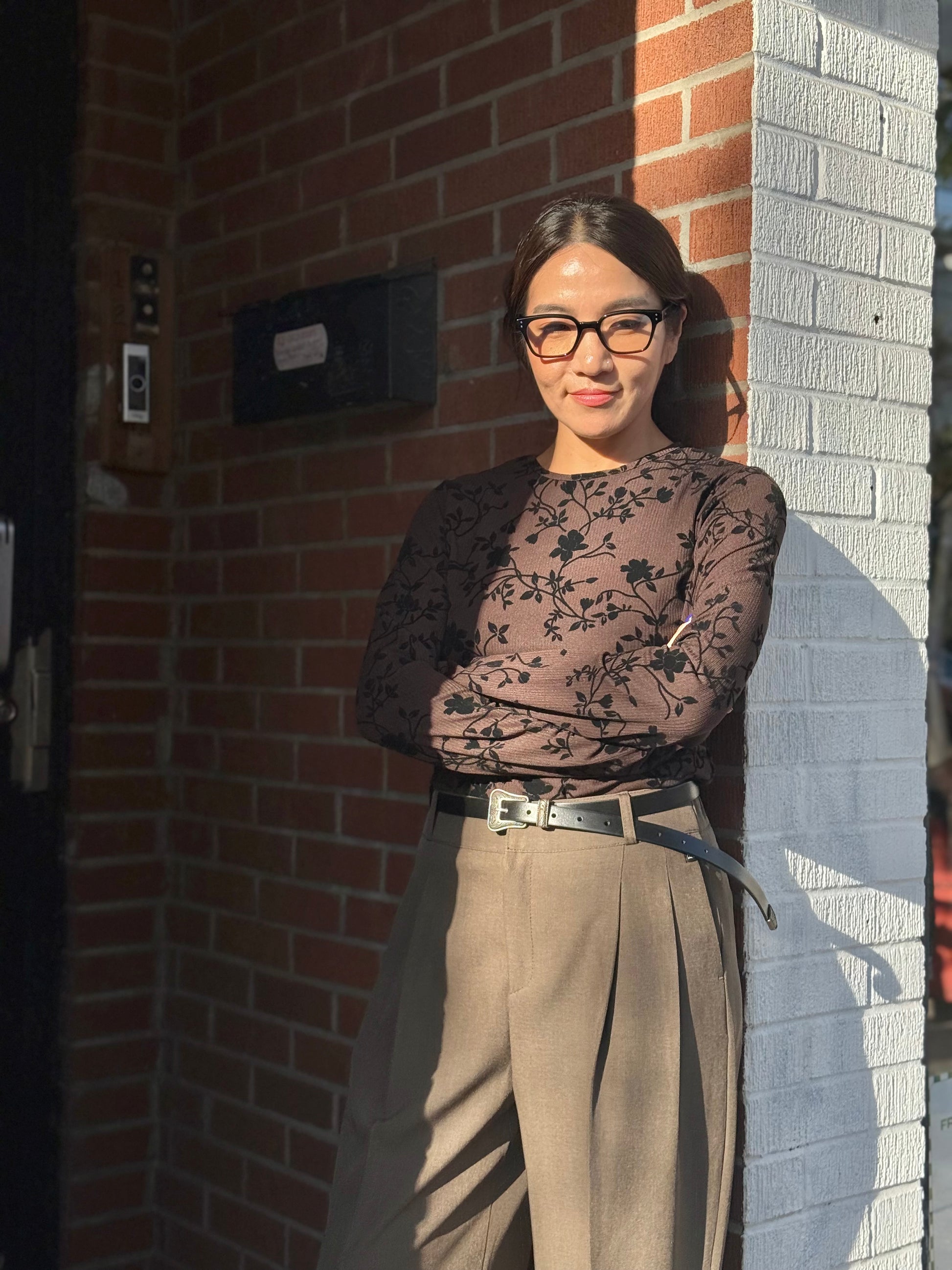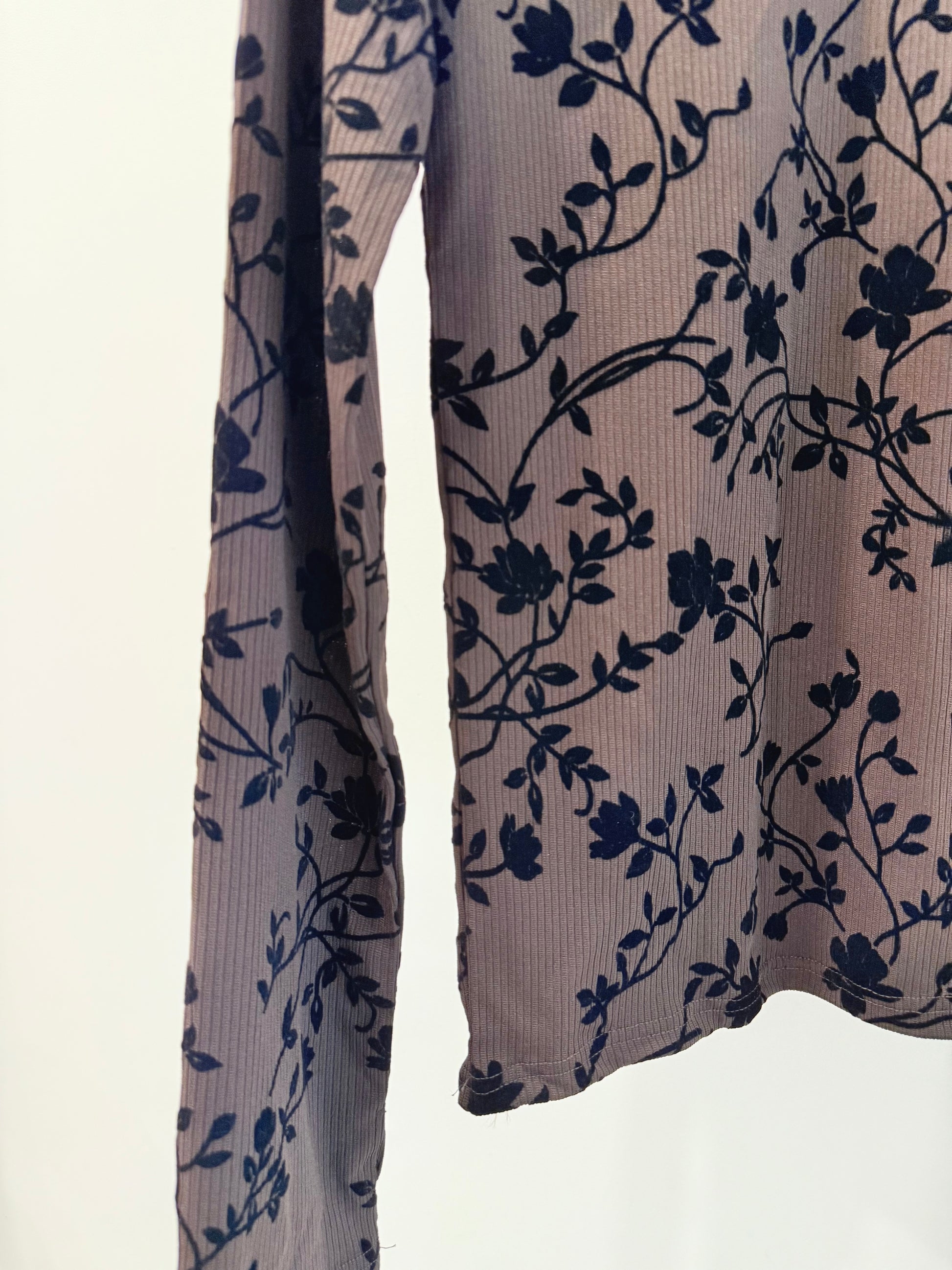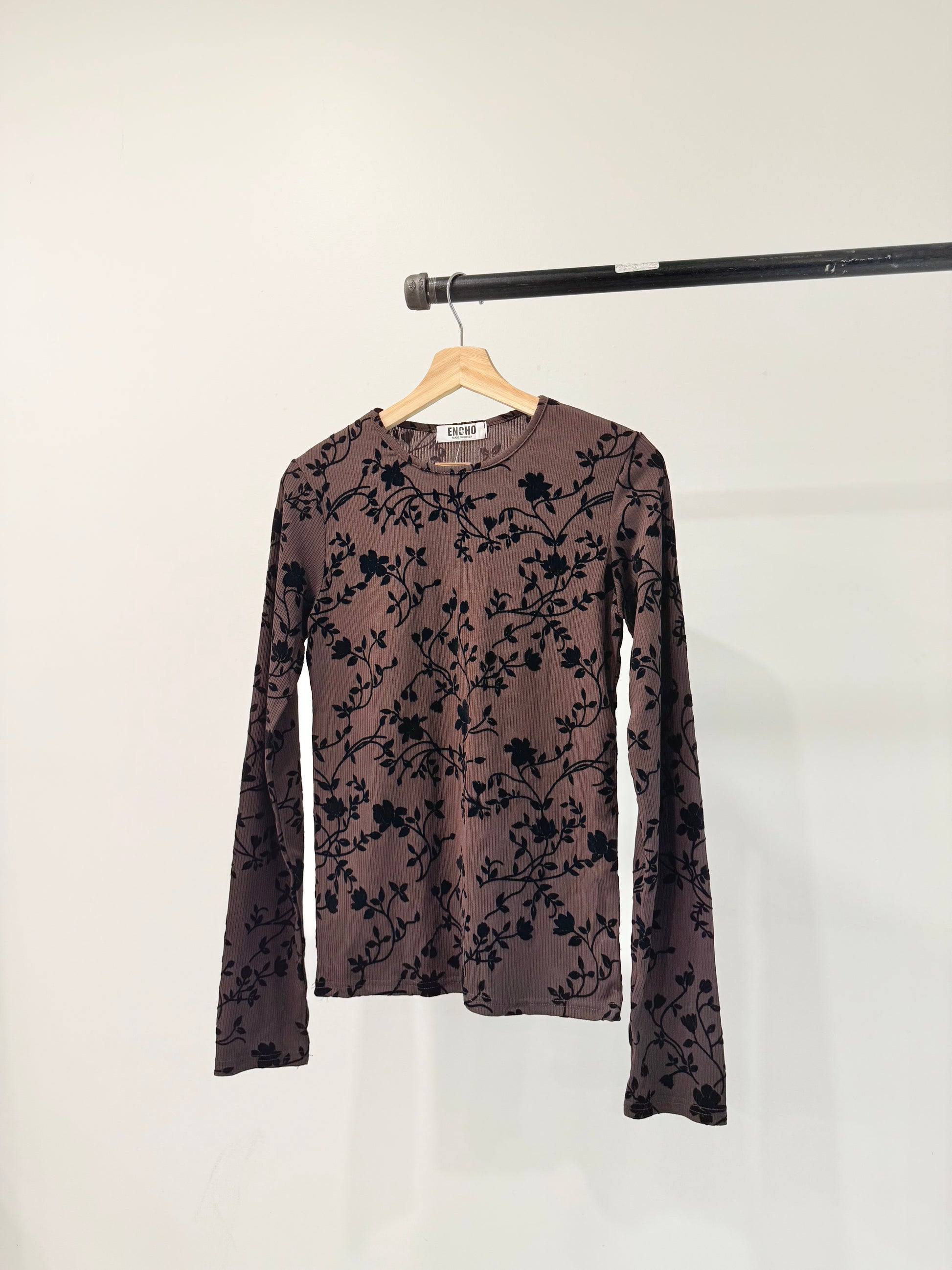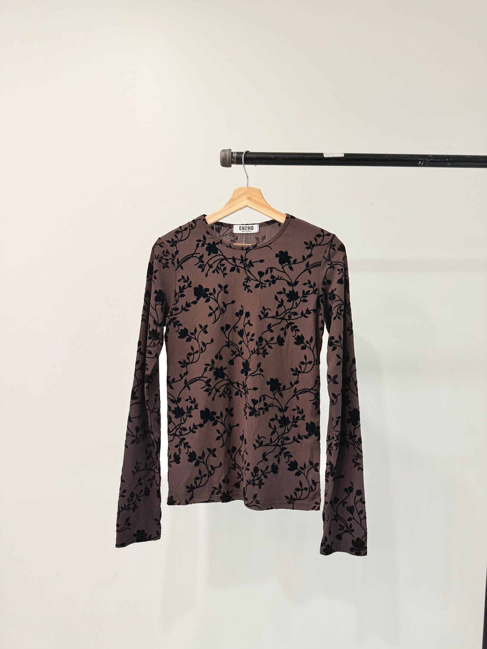 An alluring black print against a ribbed chocolate brown bodice, giving it a polished look for moments that matter, our new shirt hugs you like a dream. This long-sleeve fitted jacquard top features a sleek round neckline, overall ribbing for a sculpted fit, and a below-the-waist length for easy styling.