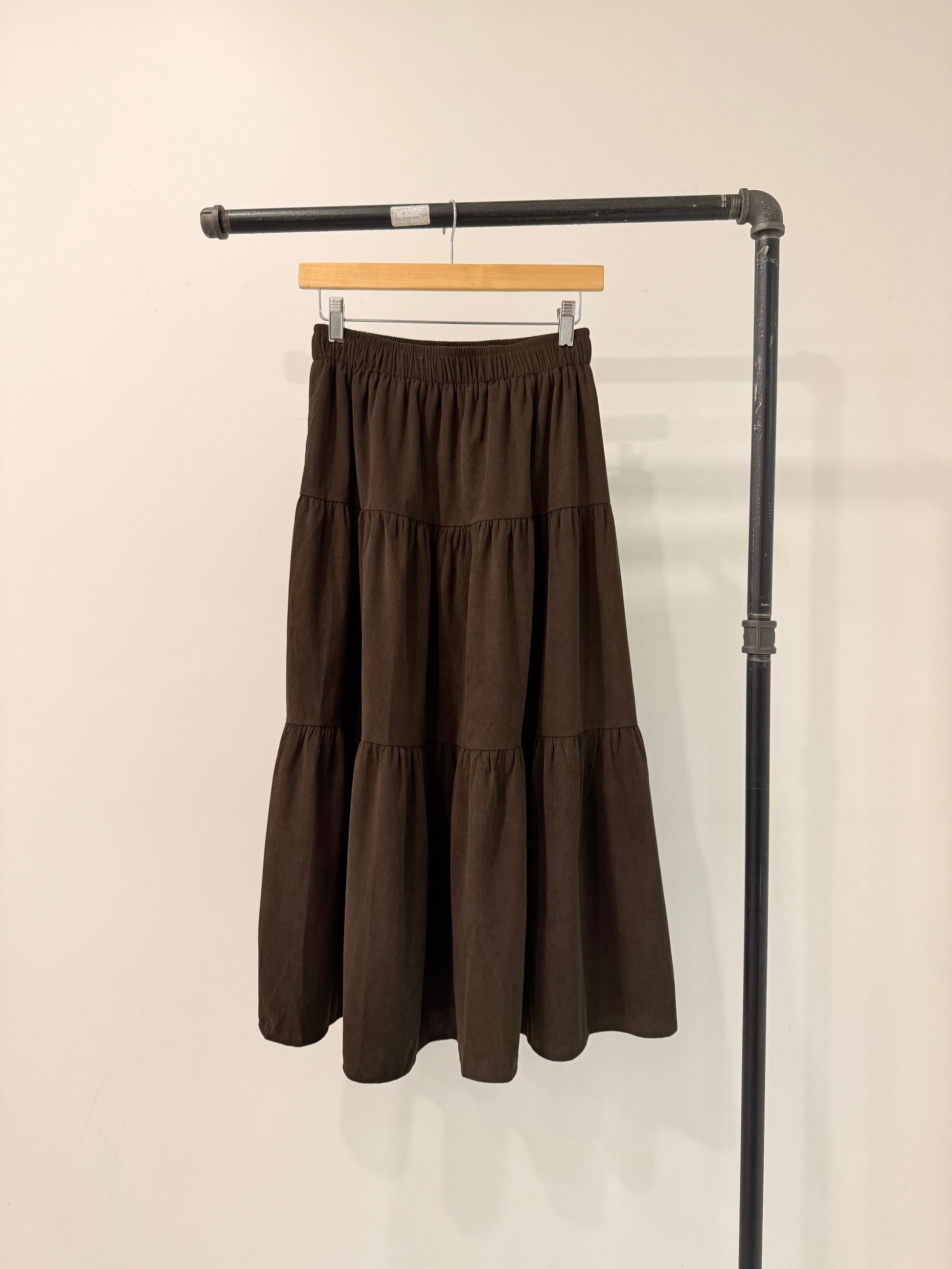 This tiered corduroy mini skirt features a soft, flared silhouette with an easy elasticated waist that moves with you. The warm, structured feel of the corduroy makes it ideal for colder days, giving you comfort without losing shape.